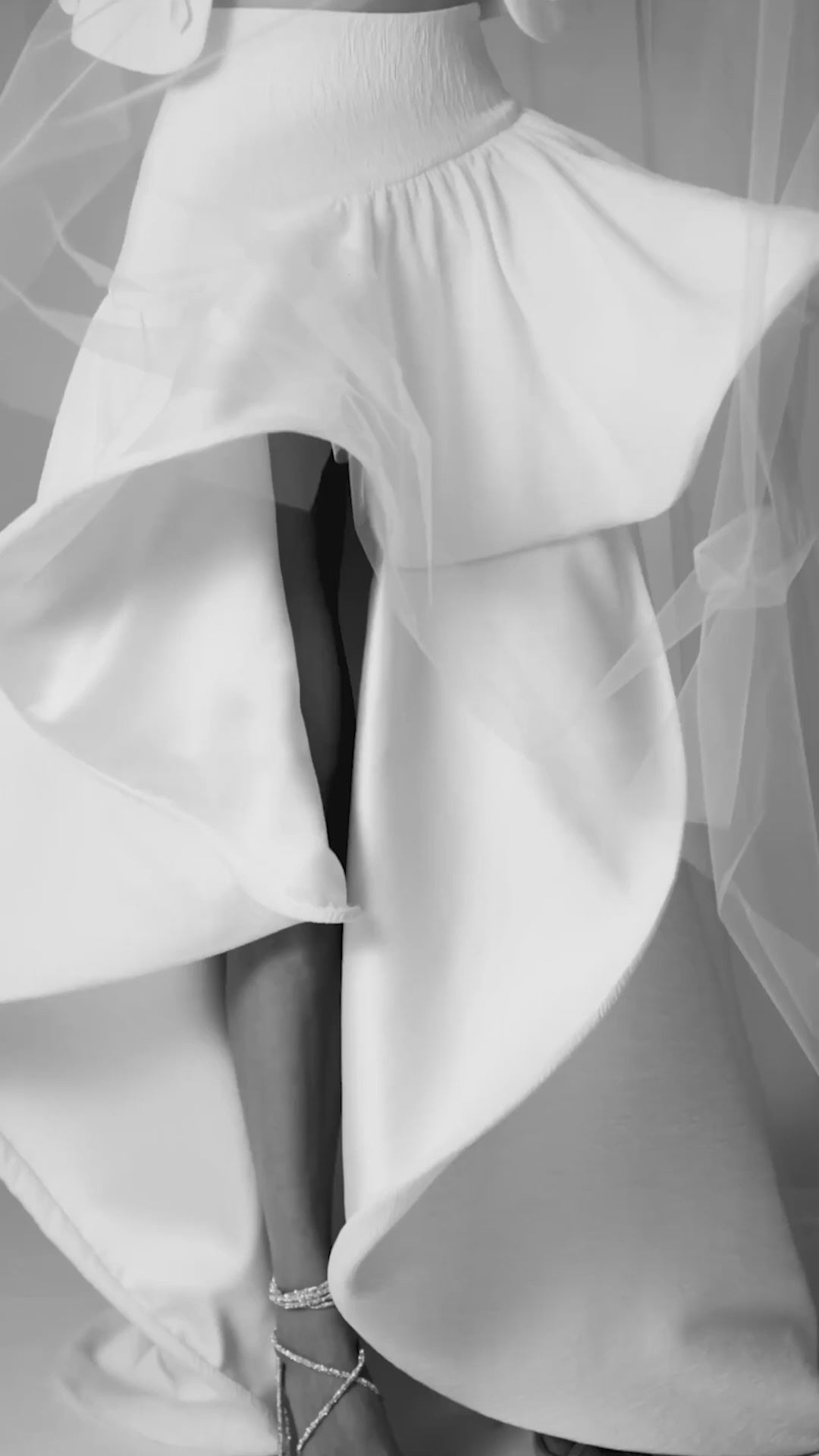 Three-piece set. Short jacket with ceramic appliqués, crop top with a straight neckline, and high-waisted ruffled skirt.