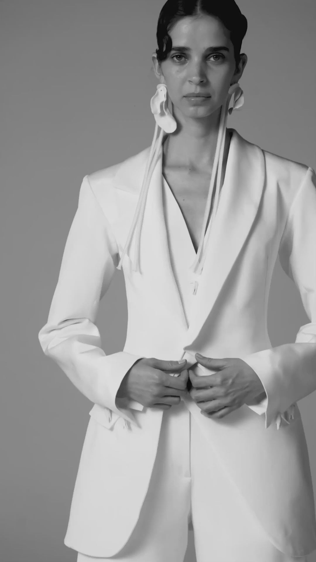 Three-piece set. Asymmetrical jacket, fitted vest, and wide-legged trousers with a wide waistband and long side ties in silk crepe.