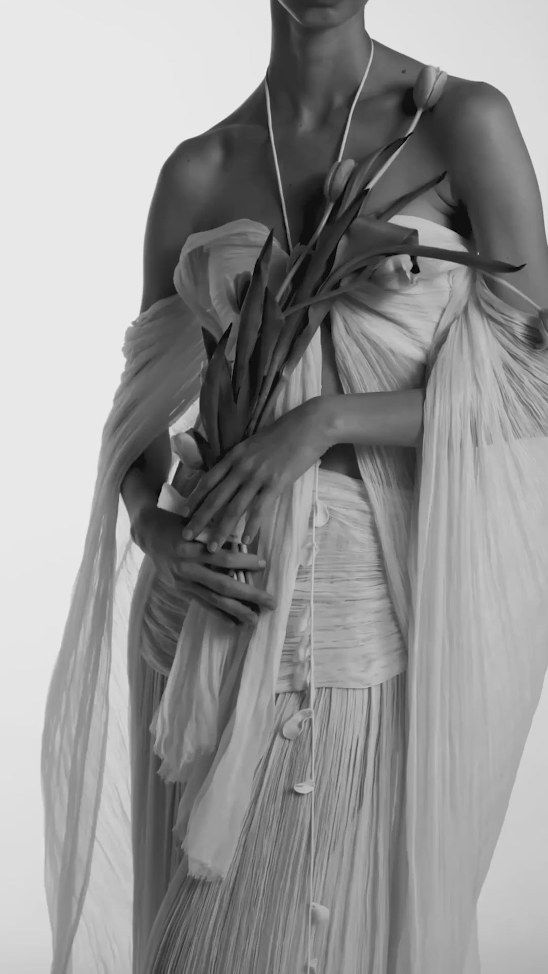 Two-piece set. Strapless top with long straps and silk chiffon pants with an asymmetrical waistband.