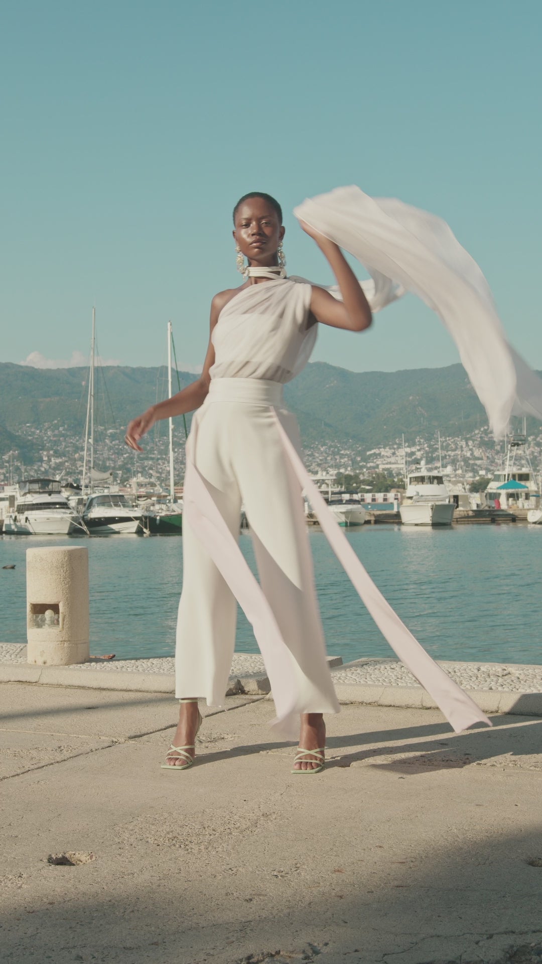 Off-white silk crepe one-shoulder jumpsuit with shorts and a wide belt with long side ties. Available in other colors. Contact the showroom here.