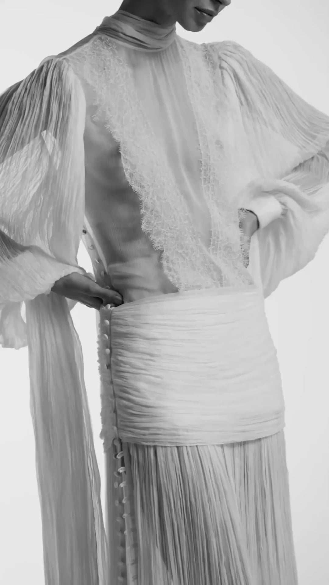 Long dress with a Mao collar and long sleeves in silk chiffon with lace appliqué at the waist.
