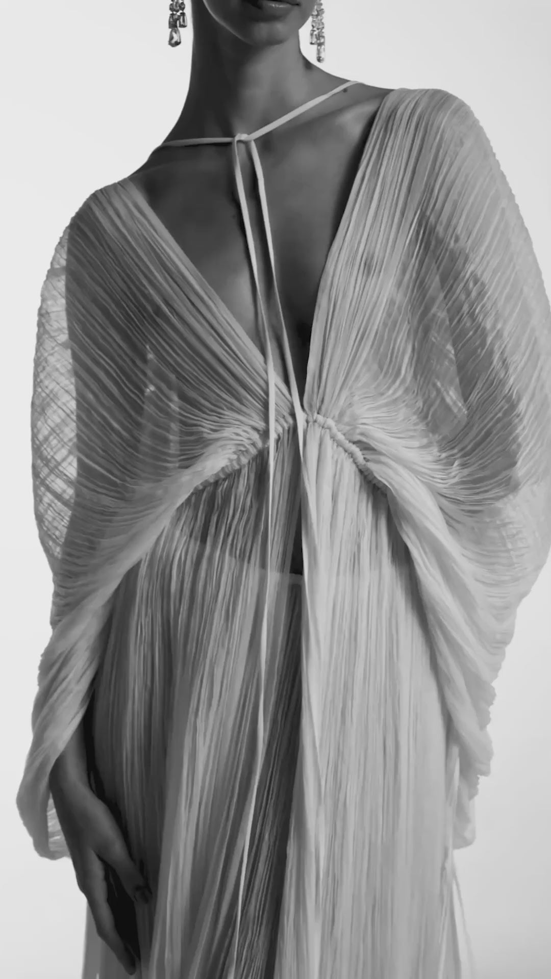 Long kaftan-style dress with a silk chiffon neck tie and long shoulder straps in silk organza.
