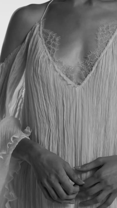 Two-piece dress. Long-sleeved, off-the-shoulder top with lace appliqué at the neckline and a full, flowing silk chiffon skirt.