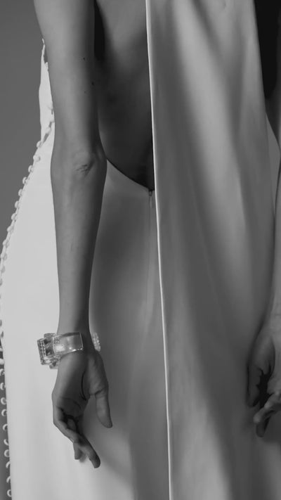 Long dress with halter neckline and loop detail on the sides and long cape on the back in silk crepe.