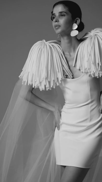 Short dress with a round neckline in silk crepe, shoulder pads with straps made of silk organza, and a long tulle cape.